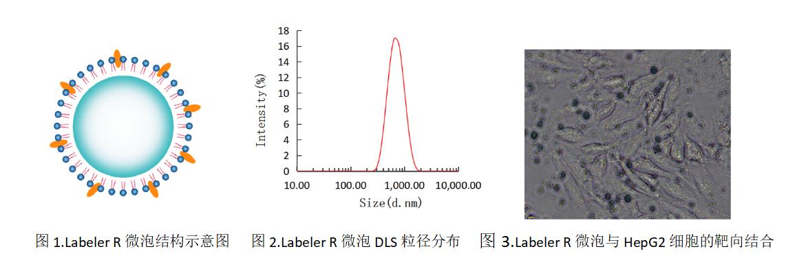 Labeler R超声微泡的结构示意图、DLS粒径分布图及和细胞靶向结合情况如图1、图2和图3所示。