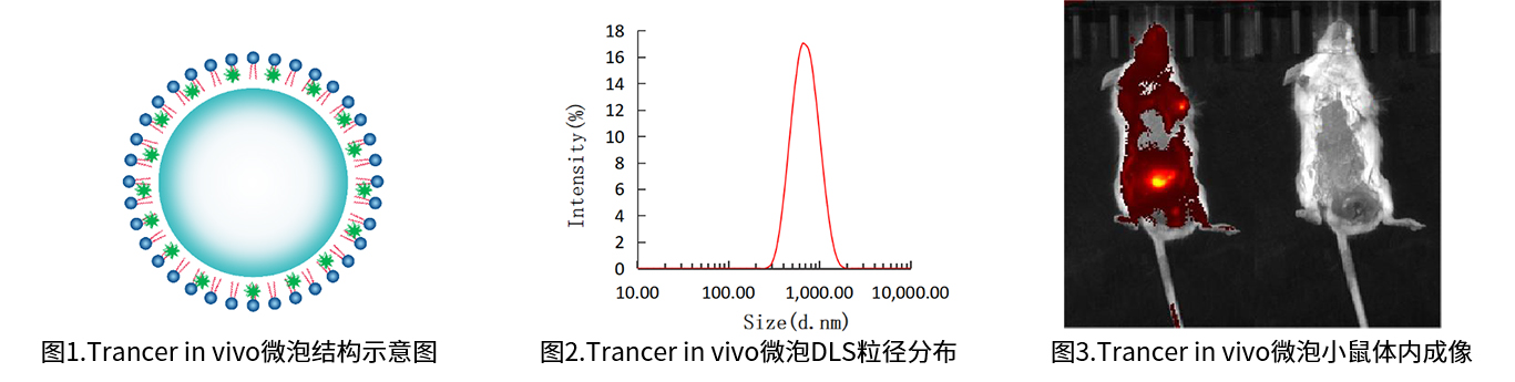 Tracer in vivo超声微泡的结构示意图、DLS粒径分布图和小鼠体内成像图如图1、图2和图3所示。