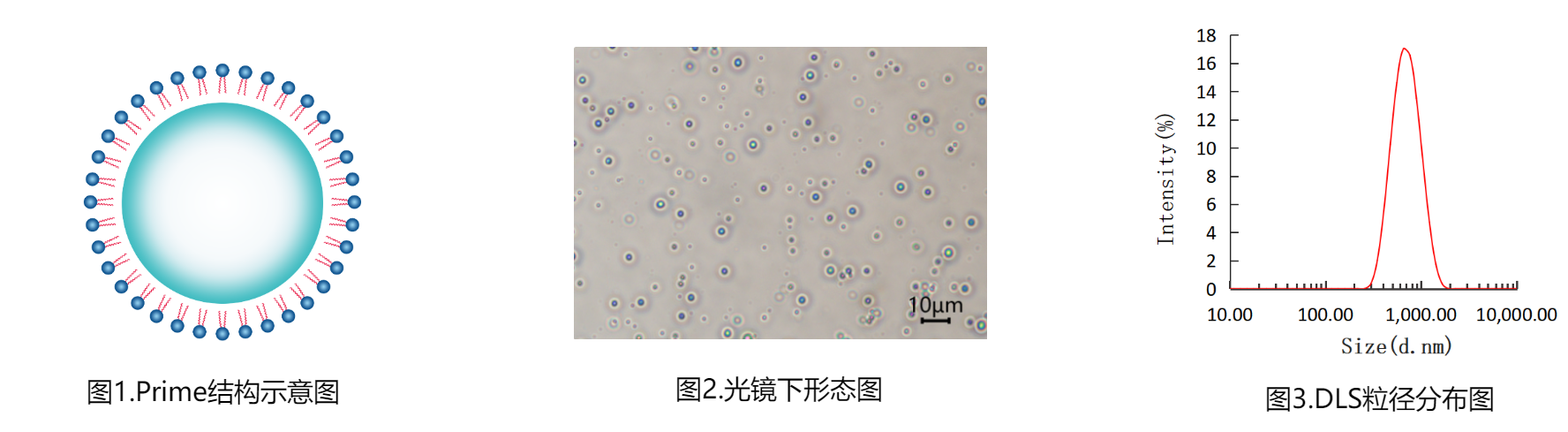 Prime微泡的结构示意图、光镜下形貌图和DLS粒径分布图如图1、图2和图3所示。